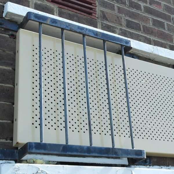 Where prefabricated/folded steel screens are not suitable, we will use sheets of perforated steel sheet, hand-cut on-site to fit difficult shapes or openings. Wherever possible we will use only a single sheet of steel for each window or opening, not multiple smaller sheets riveted together.