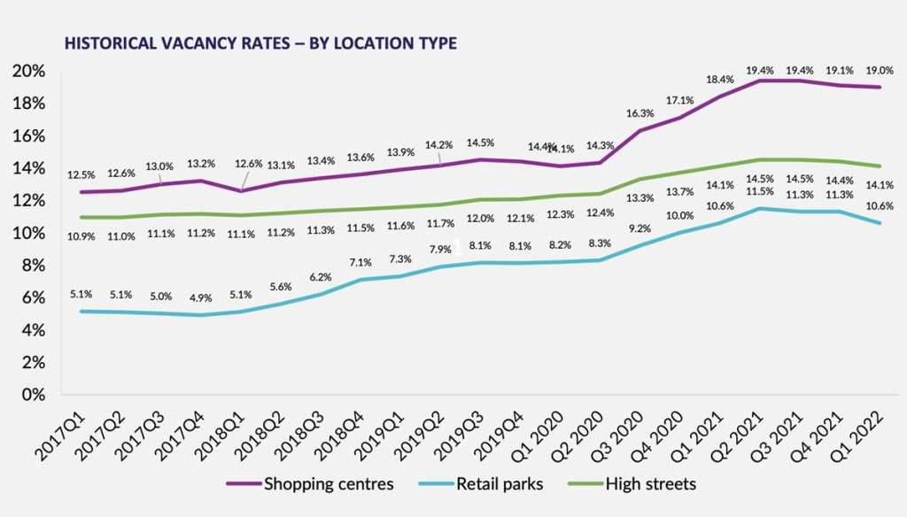 While in Q4 no shopping locations saw an increase in vacancy rates since the start of the pandemic, Q1 2022 saw a decrease in vacancy rates for each location.
